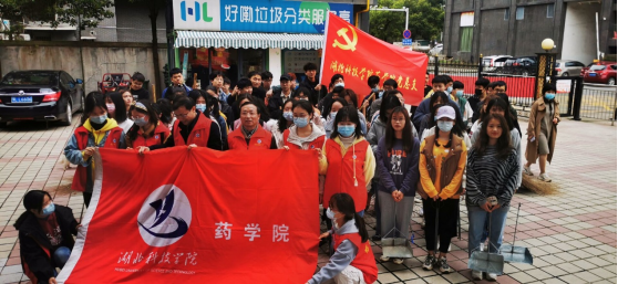 14时30分,药学楼下已经集合了参与本次活动的全体人员,同学们高举红旗,引领着队伍于南门出校步行至湖北科技学院住宅小区。