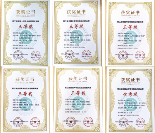 在这场高手云集的赛场上,经过激烈角逐,beat365英国官方网站最终斩获6项国家级奖项,取得历史性突破。由胡明丽老师指导的赵可同学负责的项目《“POP AROMA爆珠香水贴”智能交互式情绪调节系统》、王诗老师指导的李佩瑶同学负责的项目《灵眸·Janus 双相仙灵脾眼膜》、程琪庆老师指导的左秋月同学负责的项目《ColorSense科颜感——智能变色痘痘贴》、莫启贵老师指导的杨欣怡同学负责的项目《活参静膜·人参干细胞驱动“睡膜”动态驻颜》、以及边樱等老师指导的章意婷同学负责的项目《柏术遗韵香水》荣获全国三等奖。由张丹丹老师指导的袁馨同学负责的项目《基于仿生渗透与生态珠光的中药智能护发系统研发》项目荣获全国优秀奖。获奖项目涵盖了产品创意与配方创意两大主流赛道,体现了学生多元的创新视角与扎实的专业功底。