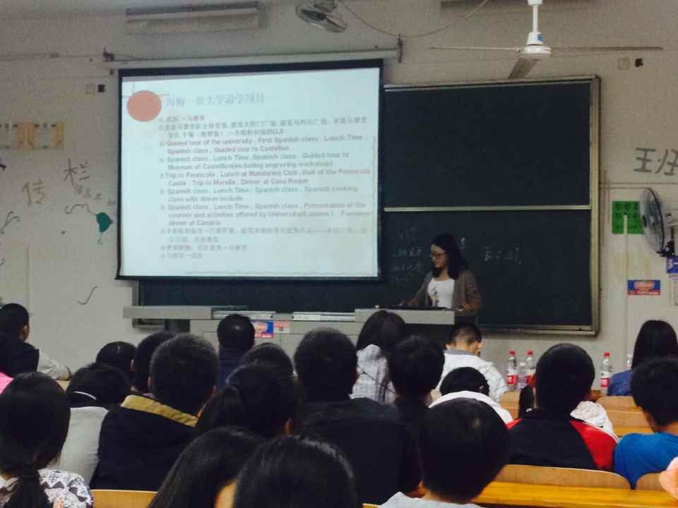 此次活动主要以PPT的形式展开。13级柳伊和张婉婷两位学姐分别向大家介绍了西班牙的饮食文化和旅游文化。PPT上一张张精美的照片向大家展示了西班牙人最爱的美食,柳伊学姐生动有趣的讲解使同学们听得津津有味仿佛身临其境,也让大家了解到了西班牙与我国在饮食文化上的差异。当张婉婷学姐结合自身出国的经历为大家讲解西班牙的旅游文化时,大家都听得兴致勃勃,一边看着照片一边体会着西班牙独有的美。