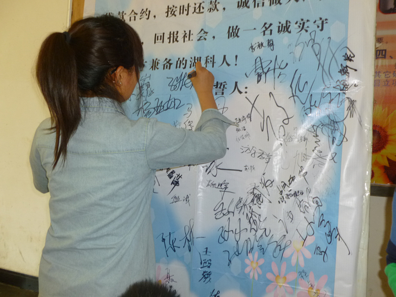 诚信是中华民族传承已久的美德,在当今科学技术高度发达,信息千变万化的社会里,诚信已不仅只是一种美德,而且在社会发展中起着重要的平衡作用。beat365英国官方网站以“严格遵守国家规定,认真履行贷款合约,按时还款,诚信做人,早日成才,回报社会,做一名诚实守信、德才兼备的湖科人”为誓词,展开了一次诚信宣誓活动,全院生源地贷款学生集体宣誓和签名。